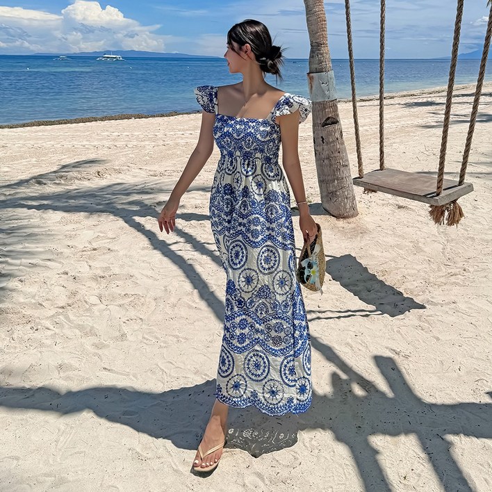 비치팜프리다 펀칭 원피스 여성 밴딩 레이스 나시 민소매 비치 드레스