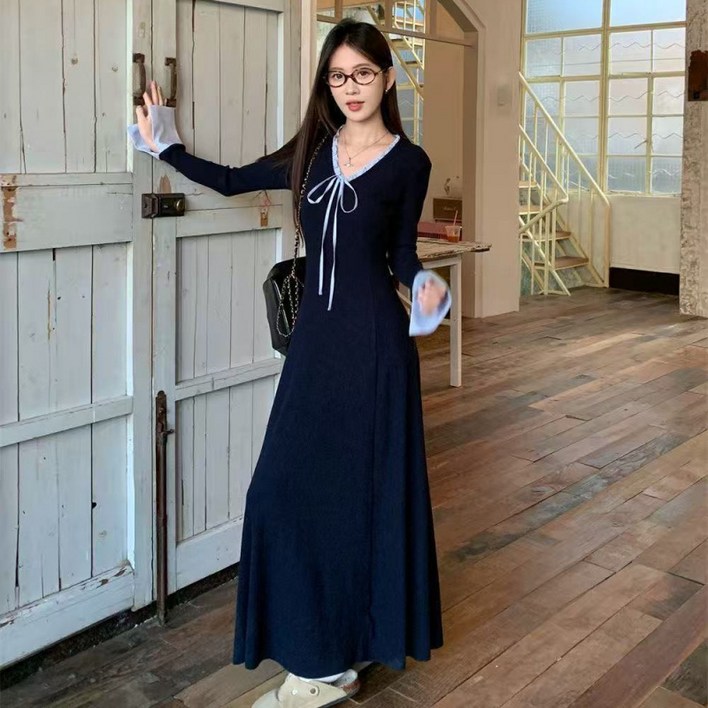 SAHINER 여성 브이넥 리본 롱 원피스 긴팔 봄가을 데일리룩 AQZ41