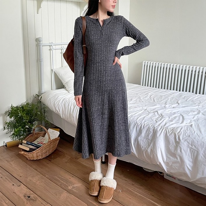 마쿠쿠 라운드넥 단추 골지 슬림 긴팔 여성 A라인 롱 니트 원피스