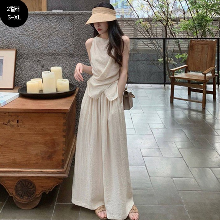 FANSYLI 여성 여름 바캉스 비치웨어 세트 민소매 조끼 블라우스 와이드팬츠 슬랙스 정장 상하복 2종 세트 오피스룩 빅사이즈 2603JLL6087