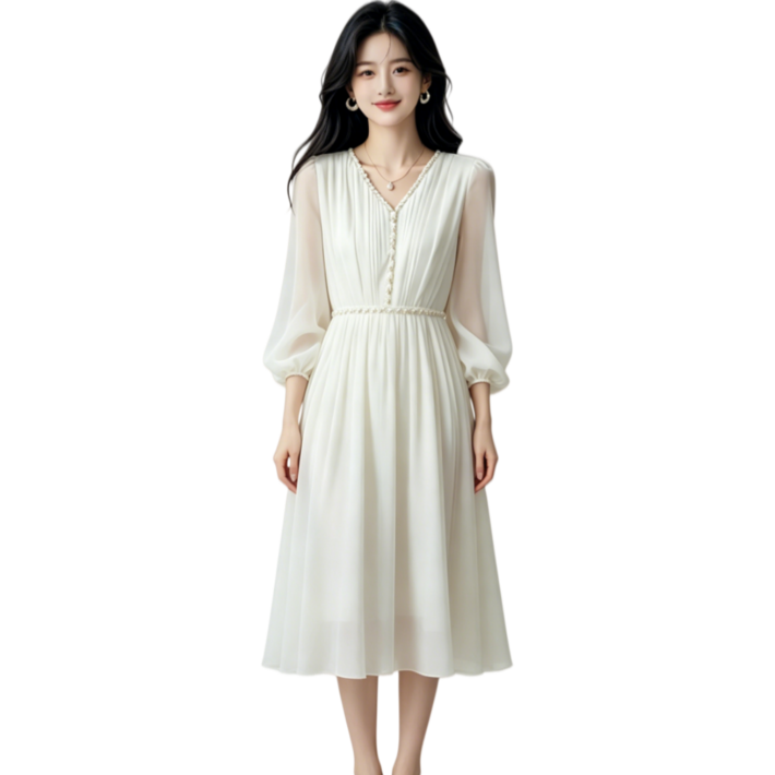 비아이와이 여성 쉬폰 캐주얼 화이트 긴팔 롱 원피스 DH1032